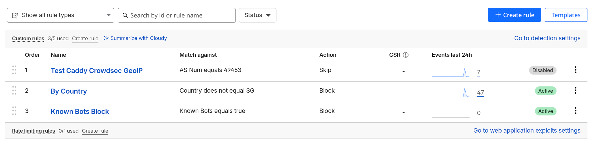 During testing, a temporary Skip rule can be added for specific VPN ASNs (e.g., AS49453) and using my mobile phone with overseas server, to verify local Caddy Geo-IP fail-safes.