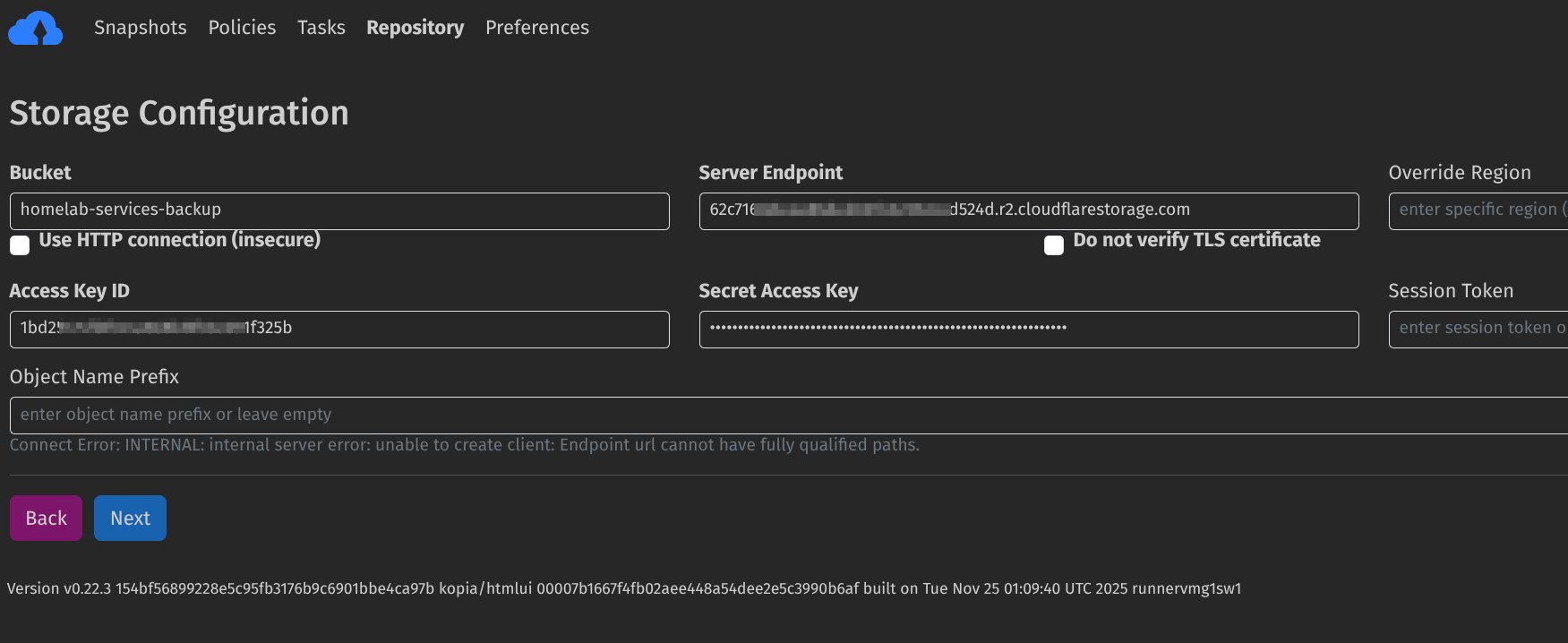 - Connect Kopia to the Existing Repository (Cloudflare R2) using the exact same credentials and Master Password from Step 3.