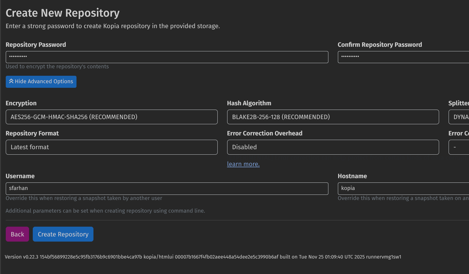 During the repo setup, we will be asked to set a repository password. If we lose this password, our cloud backups are permanently unrecoverable. This password must perfectly match the KOPIA_PASSWORD=${KOPIA_REPO_PASSWORD} variable in our .env file so the container can auto-mount the bucket on reboot.