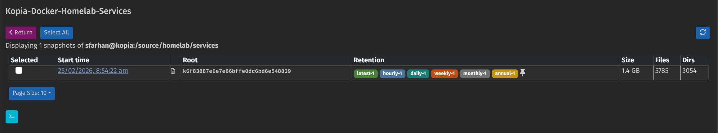 Once connected, we must define the backup schedule and retention policy for the /source/homelab/services directory. We can do this via the Web UI, or execute it instantly via the CLI: